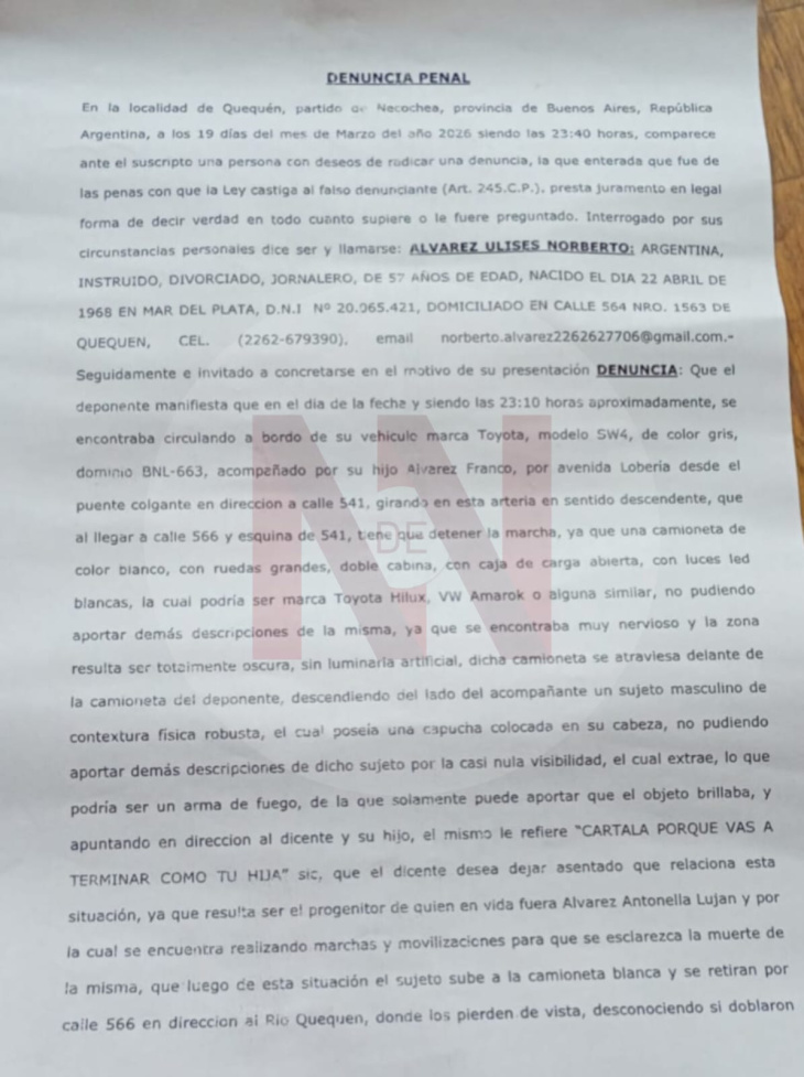 De acuerdo al documento, el episodio ocurrió cerca de las 23:40, cuando Álvarez se trasladaba a bordo de una camioneta Toyota SW4 gris acompañado por su hijo Franco.