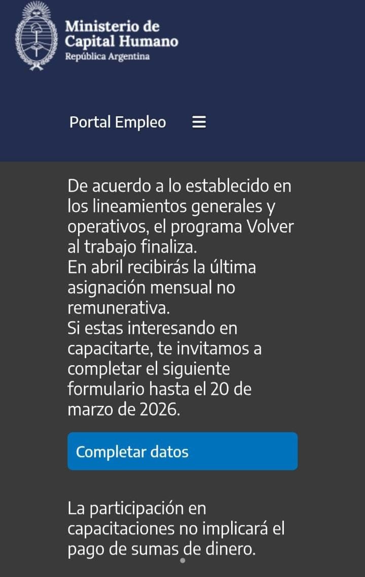 La medida del Gobierno nacional comenzará a regir desde el 9 de abril y alcanzará a los beneficiarios del programa Volver al Trabajo, quienes podrán optar por inscribirse en un sistema de capacitación laboral.