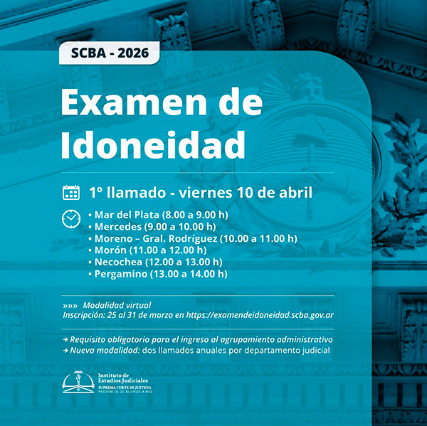 El examen se llevará a cabo el 10 de abril en distintos departamentos judiciales, con un cronograma escalonado por sedes. En el caso de Necochea, la evaluación se realizará de 12 a 13 horas.