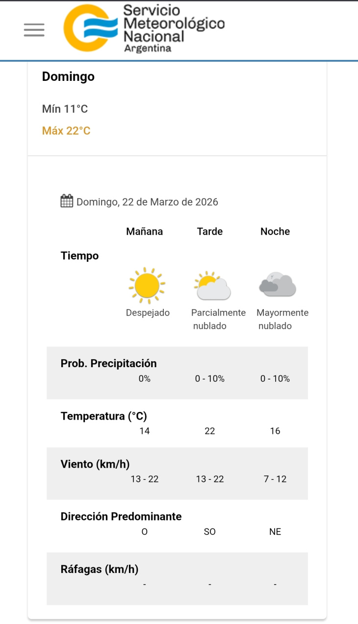 El viento soplará entre 7 y 22 km/h, predominando del oeste y sudoeste, con rotación hacia el noreste hacia la noche.