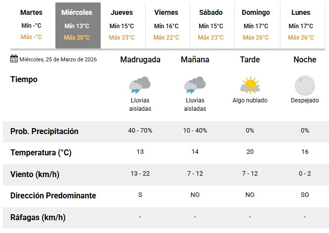 De esta manera, el miércoles comenzará con inestabilidad y lluvias aisladas, pero con mejora hacia la tarde y condiciones más estables hacia la noche.
