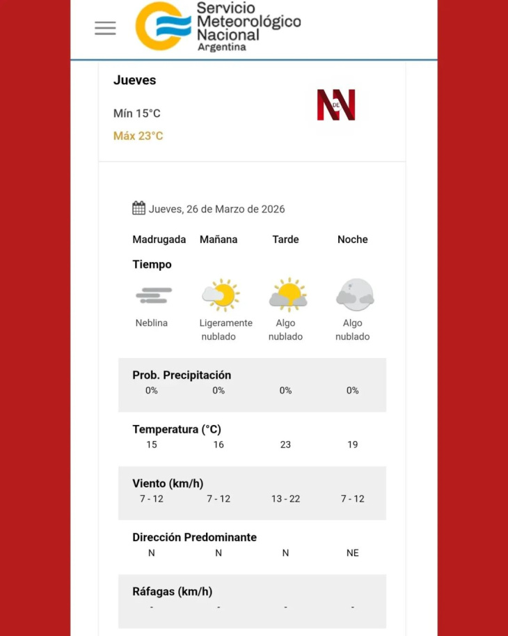 El viento soplará leve del sector norte, con velocidades entre 7 y 22 km/h durante la jornada.