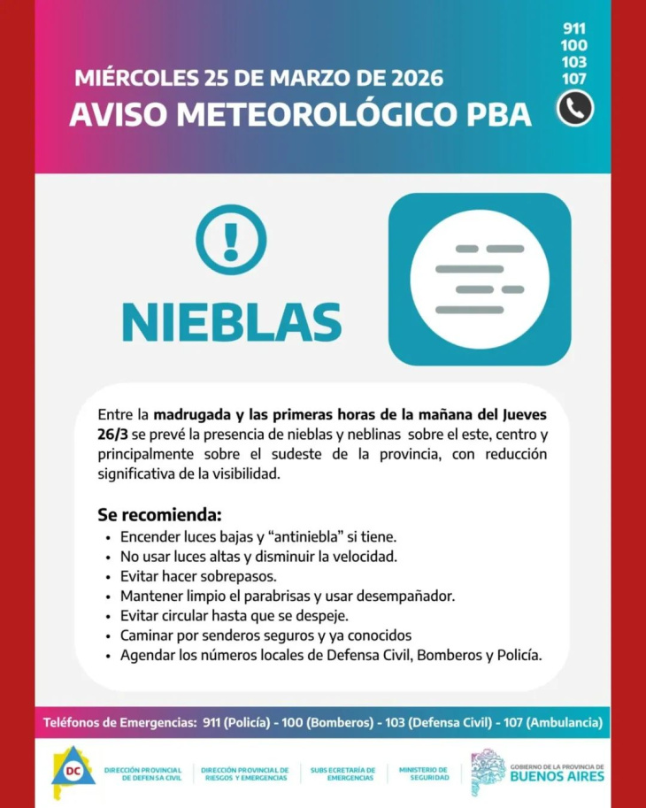 Según el panorama meteorológico previsto, el fenómeno afectará principalmente al noreste, centro, este y sudeste de la provincia de Buenos Aires, y se espera que las condiciones comiencen a mejorar alrededor de las 10 de la mañana, cuando las nieblas se disipen progresivamente.