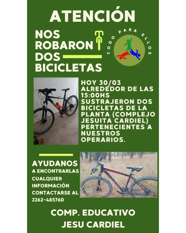 Ante esta situación, desde el Taller Protegido “Todo Para Ellos” solicitaron la colaboración de la comunidad para intentar recuperar las bicicletas, destacando que se trata de un medio de transporte fundamental para los trabajadores.