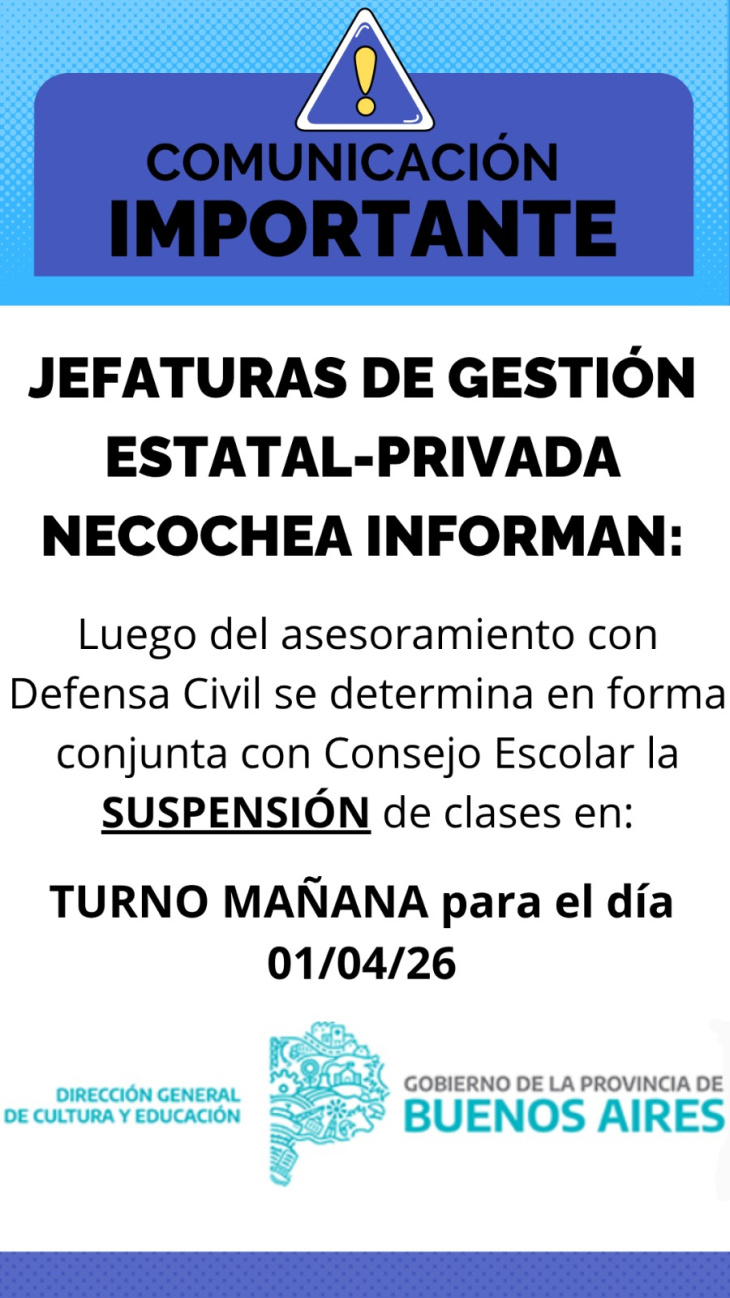 La decisión fue adoptada tras el asesoramiento de Defensa Civil y en forma conjunta con el Consejo Escolar, ante el pronóstico de tormentas fuertes con lluvias intensas, ráfagas y posible caída de granizo.