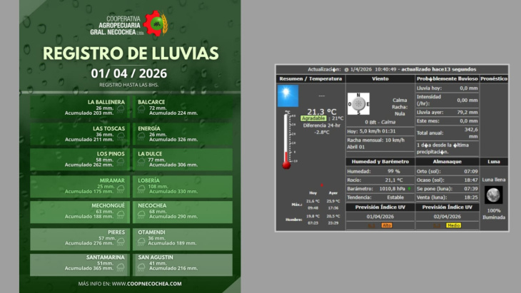 De acuerdo a estos datos, el total anual acumulado alcanza los 342,6 mm según el Radio Club y 290 mm según la Cooperativa.