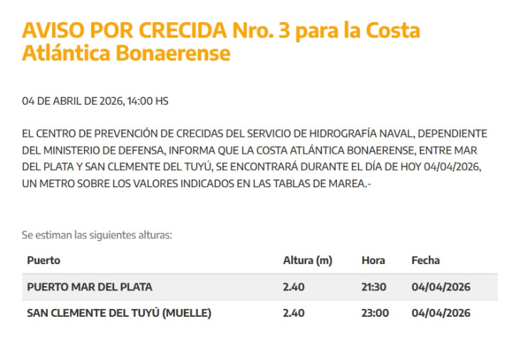 De acuerdo a las estimaciones del Servicio de Hidrografía Naval, los picos más importantes se registrarían en: