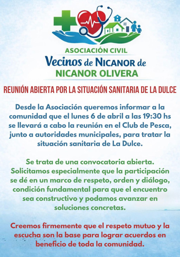 La comunidad de Nicanor Olivera (La Dulce) volverá a reunirse este lunes 6 de abril a las 19:30 en el Club de Pesca, en el marco del reclamo por la situación sanitaria que atraviesa la localidad y la falta de respuestas concretas por parte del municipio.