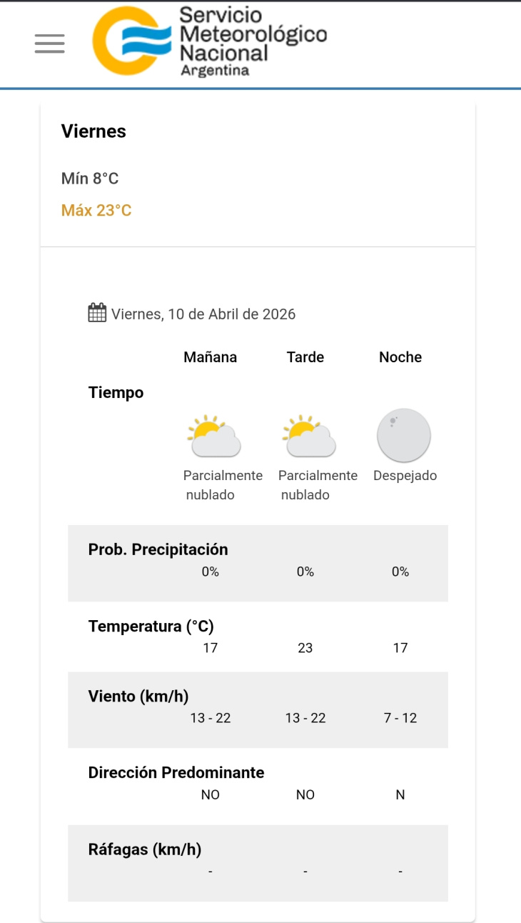 Según el pronóstico, la mañana comenzará con cielo parcialmente nublado y una temperatura cercana a los 17°C, con vientos del sector noroeste entre 13 y 22 km/h.