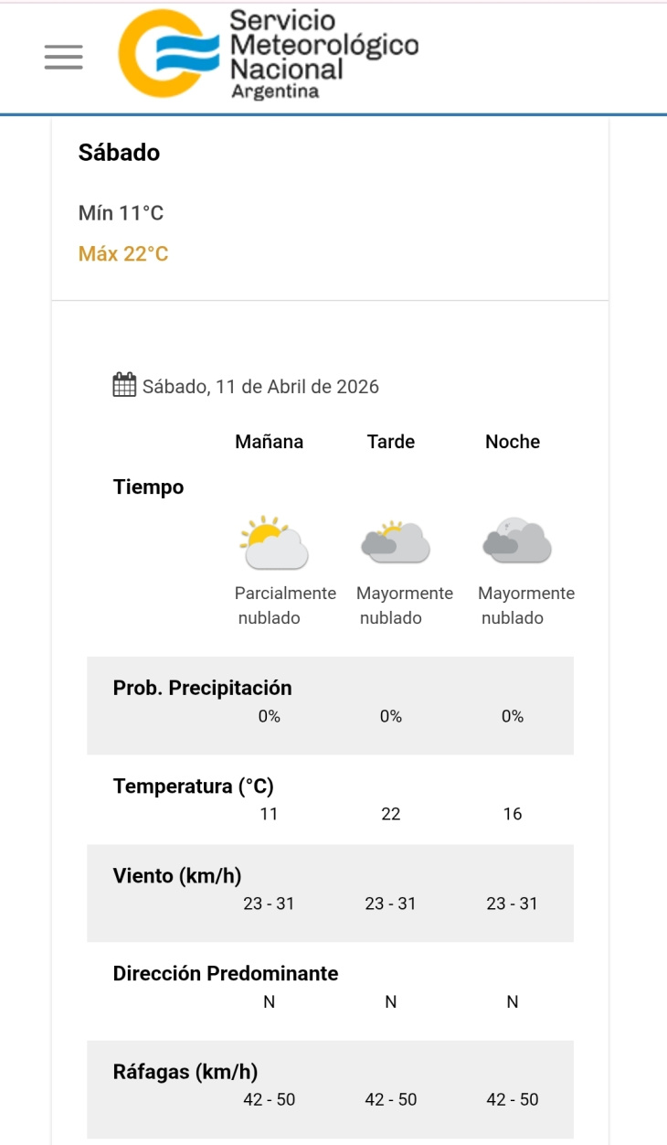 Durante la mañana, el cielo estará parcialmente nublado, con una temperatura mínima de 11°C. El viento soplará desde el norte entre 23 y 31 km/h, con ráfagas que podrían alcanzar entre 42 y 50 km/h.