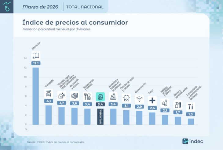 En tanto, Alimentos y bebidas no alcohólicas registró un aumento del 3,4%, en línea con el índice general, manteniendo el impacto sobre el gasto cotidiano.
