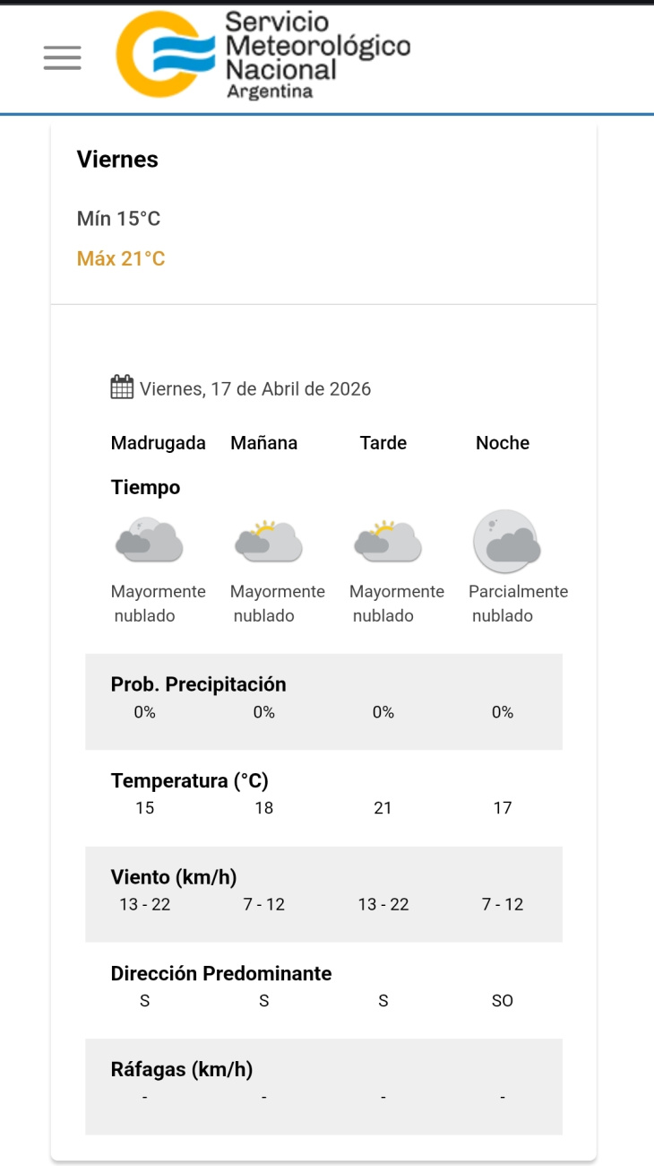 El viento soplará del sector sur y sudoeste, con velocidades que oscilarán entre los 13 y 22 km/h durante gran parte del día, disminuyendo hacia la noche.