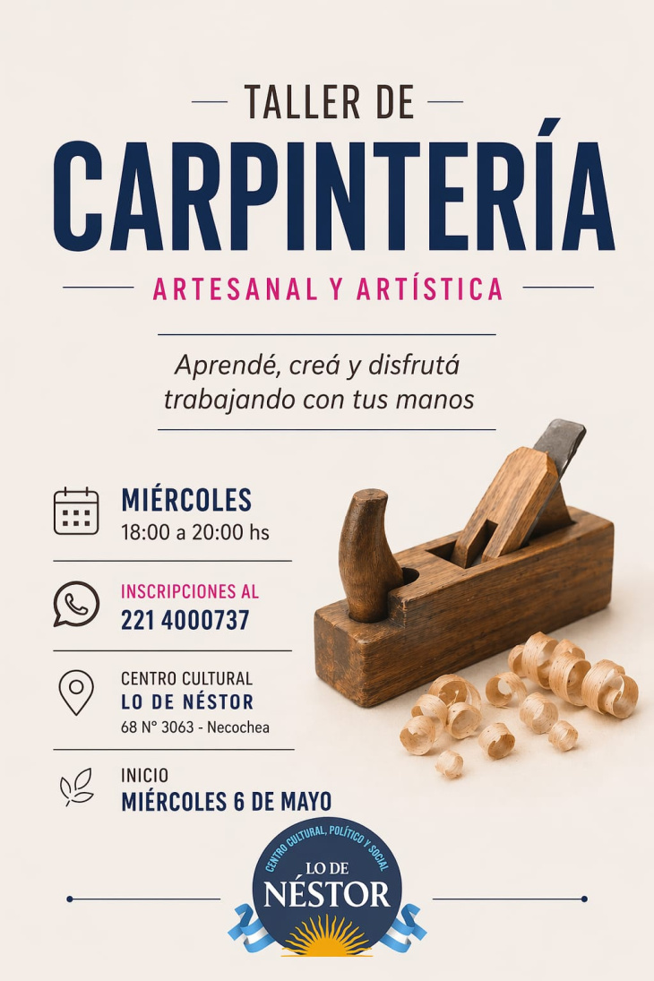 También se suma un taller de carpintería artesanal y artística, enfocado en el aprendizaje de técnicas y el desarrollo de proyectos propios, con eje en la creatividad y el trabajo colectivo.