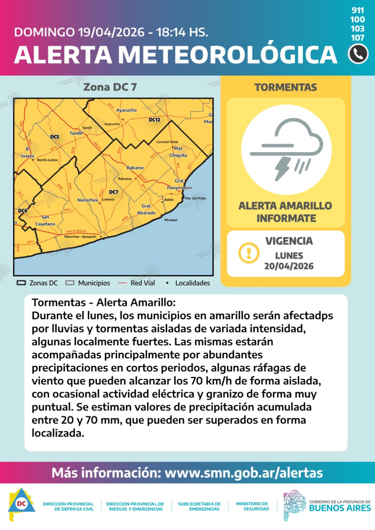 La alerta rige para Necochea y distritos de la zona sur y sudeste de la provincia de Buenos Aires, dentro del área identificada como DC7 por Defensa Civil.