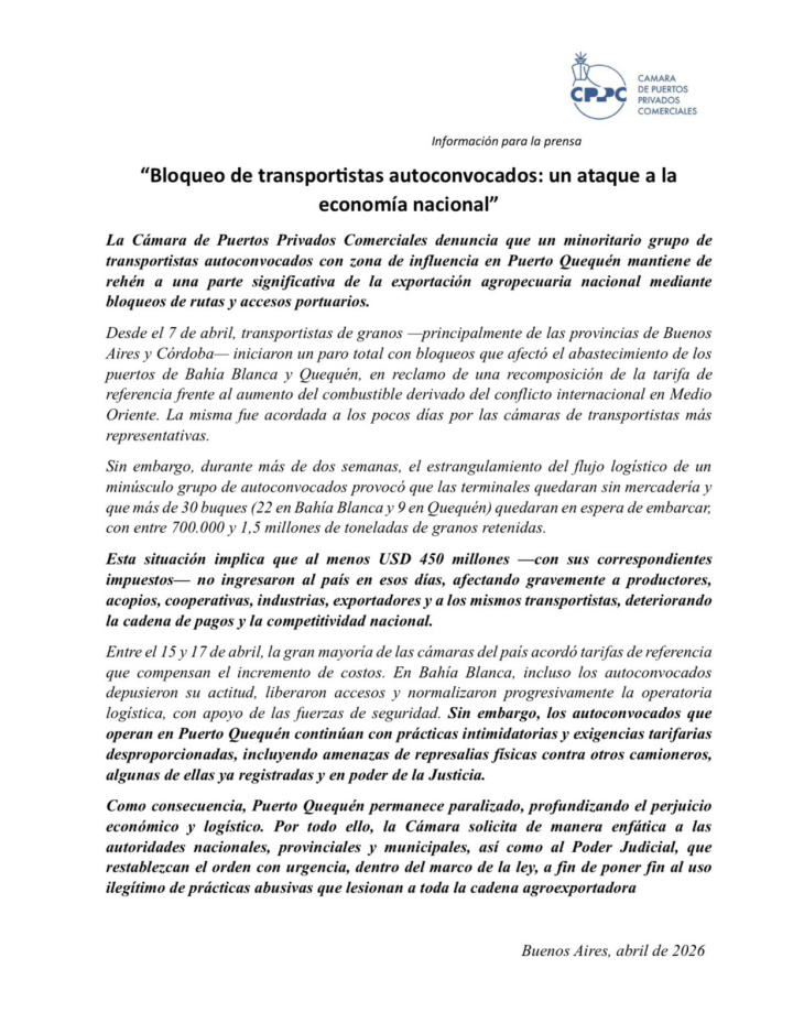A través de un duro comunicado, la Cámara de Puertos Privados Comerciales denunció que un “minoritario grupo” de camioneros mantiene bloqueos en rutas y accesos portuarios, afectando directamente el flujo logístico y la salida de granos al exterior.