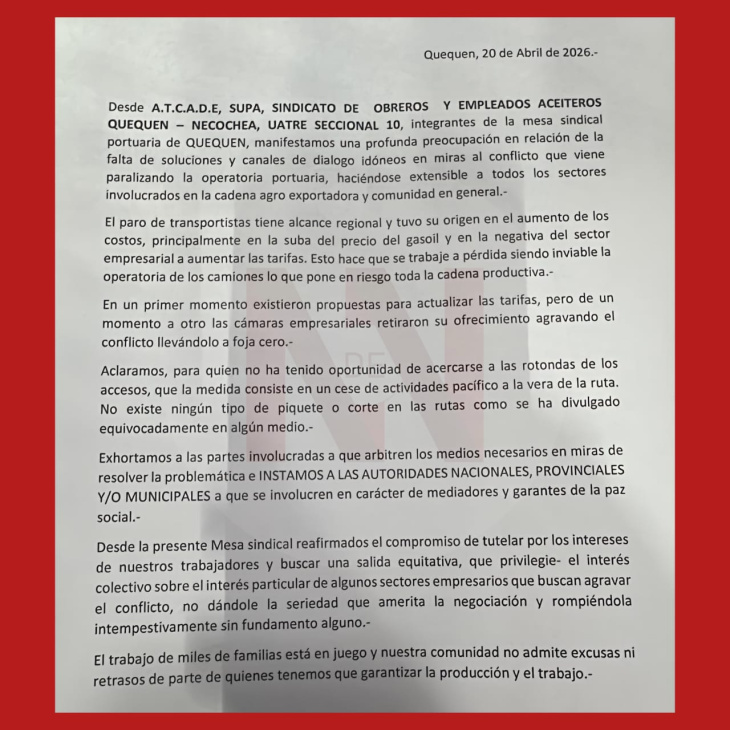 El documento, fechado el 20 de abril en Quequén, lleva las firmas de A.T.C.A.D.E., SUPA, el Sindicato de Obreros y Empleados Aceiteros Quequén-Necochea y UATRE Seccional 10, y expresa una “profunda preocupación” por la falta de soluciones y de canales de diálogo frente a un conflicto que impacta en la cadena agroexportadora y en la comunidad.