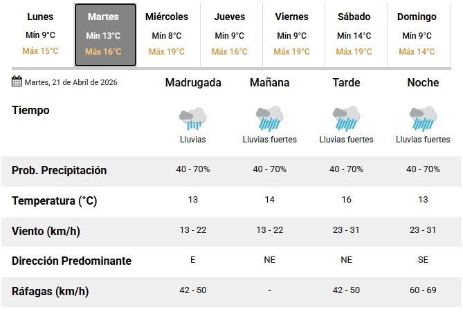 - Noche: lluvias fuertes, 13°C
