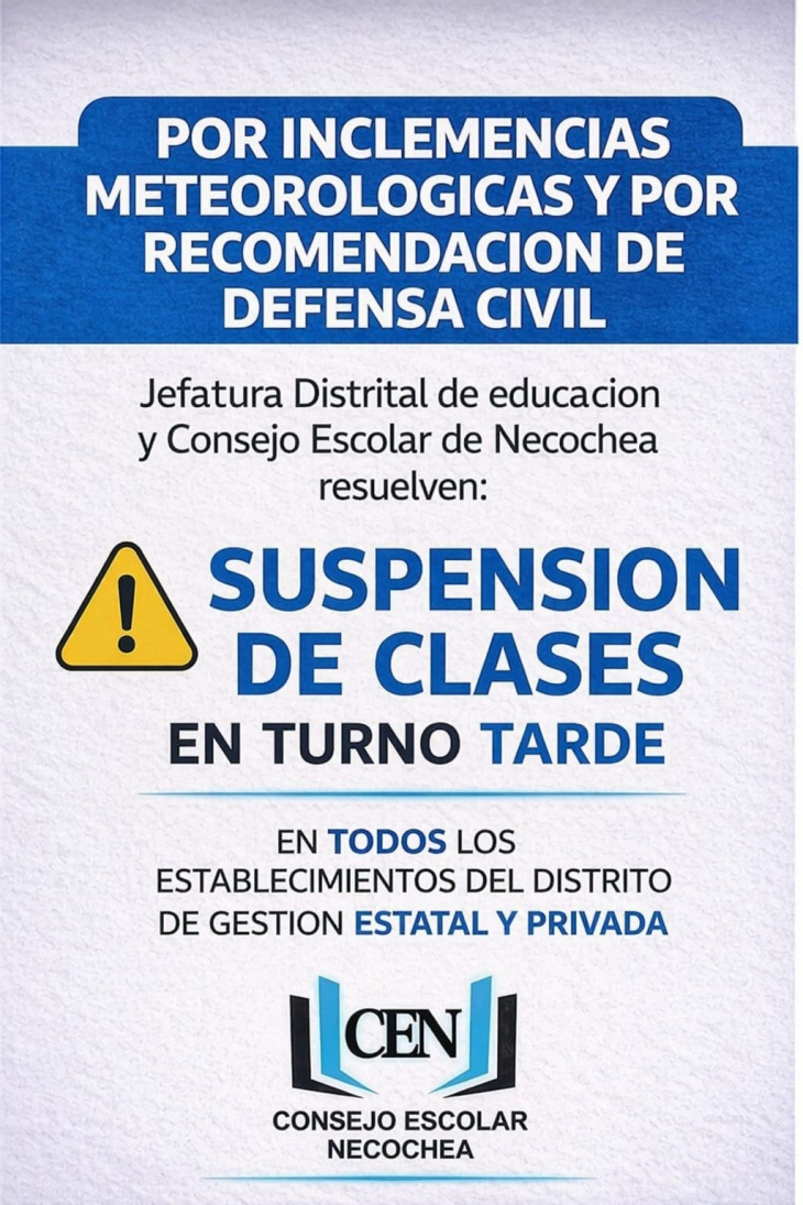 Con el avance de las condiciones climáticas y en el marco de las lluvias intensas previstas, se resolvió la suspensión de clases en el turno tarde en el distrito.