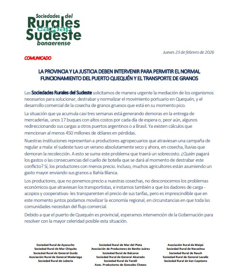 A través de un comunicado conjunto, las organizaciones pidieron “normalizar el movimiento portuario en Quequén y el desarrollo comercial de la cosecha de granos gruesos”, en un contexto que ya se extiende por casi tres semanas.