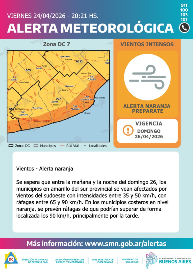 En tanto, en los sectores costeros bajo alerta naranja —como Necochea— las ráfagas podrían superar los 90 km/h, especialmente durante la tarde.