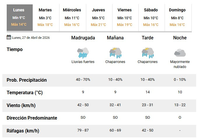 Además, el viento será otro de los factores a tener en cuenta, con ráfagas que podrían superar los 65 km/h durante las primeras horas del día.