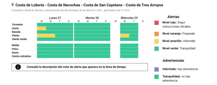 De acuerdo a los datos del Radio Club Necochea, durante el 26 de abril se acumularon 57,3 milímetros de lluvia, un valor significativo para una sola jornada y en línea con lo previsto por los pronósticos oficiales.