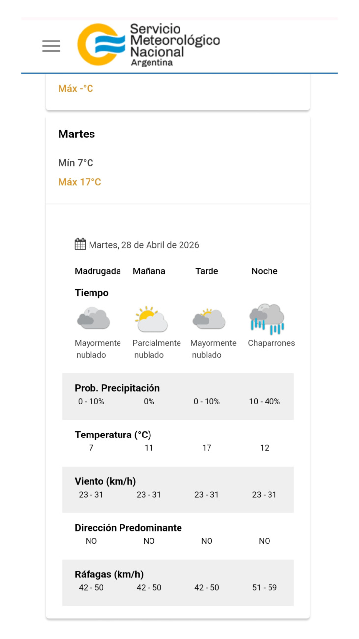 Durante la madrugada, el cielo se presentará mayormente nublado, con una temperatura cercana a los 7°C y sin probabilidades significativas de precipitaciones. El viento soplará del sector norte (NO) con velocidades entre 23 y 31 km/h y ráfagas de hasta 50 km/h.