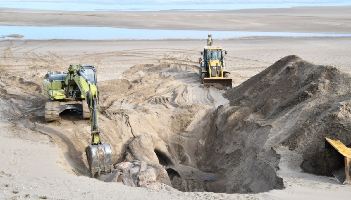 Finalmente, y tras un arduo trabajo en conjunto encabezado por la Dirección de Gestión Ambiental y las estaciones de Piscicultura e Hidrobiológica, la ballena franca encontrada muerta sobre la arena mojada, a la altura de El Caño, fue enterrada en un médano a 150 metros para que siga con su descomposición natural. El trabajo conjunto fue realizado por la Dirección de Gestión Ambiental y las estaciones de Piscicultura e Hidrobiológica.