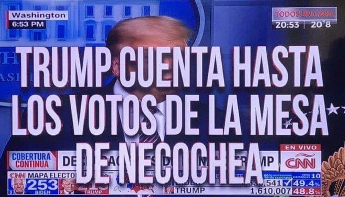 “Trump cuenta hasta los votos de la mesa de Necochea”, tituló en una de sus tradicionales placas el canal de televisión. Fue durante las horas posteriores en las que se iban contando los votos de los distintos condados estadounidenses.
